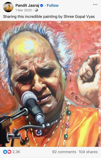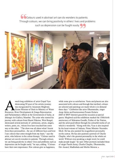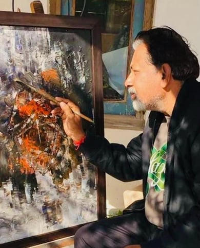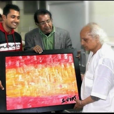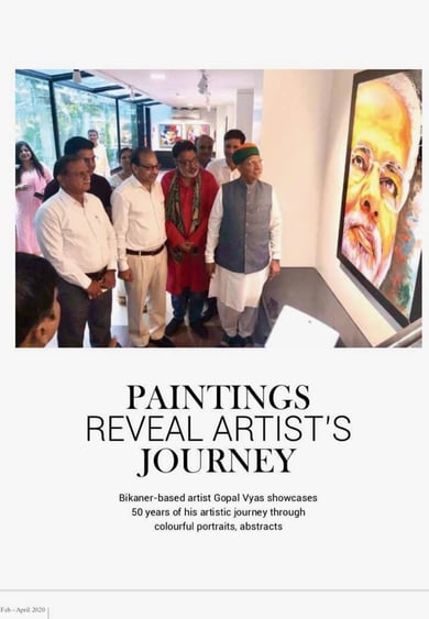 Shree Gopal Vyas is an renowned artist in the field of abstract paintings. He has exhibited his paintings in various location within India and outside India (France, Germany, Italy, Dubai and Tunisia). He was awarded by Government of India for his extraordinary contribution in the field of art. His work was published in various art magazines and has been cover image of NSD's (National School of Drama) year book for longest time period. His work was very much appriciated during his exhibition at Jahangir art gallery, Mumbai by various prominent public figures like Padma Bhooshan Pandit Jasraj, Bollywood artist Dharmendra, Singer Anoop Jhalota, Indian Law minister Arjunram Meghwal, Tina Ambani and many more.